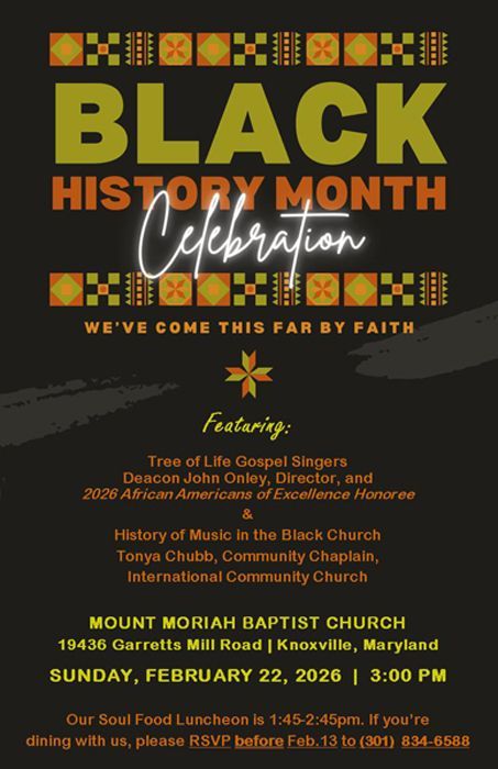 THE BLACK HISTORY PROGRAM SCHEDULED FOR SUNDAY, FEBRUARY 22, 2026, AT 3:00 P.M., HAS BEEN CANCELLED DUE TO THE IMPENDING FORCAST.
